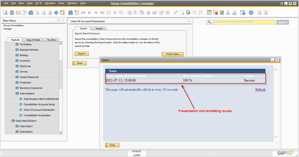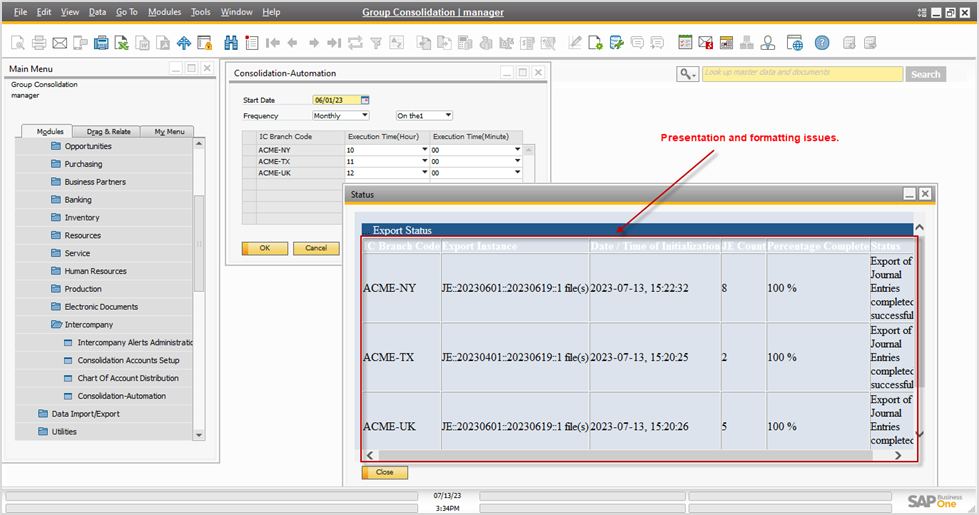 There are presentation and formatting issues in the "Automatic Consolidation – Export Status". Also, the column header names do not appear properly.