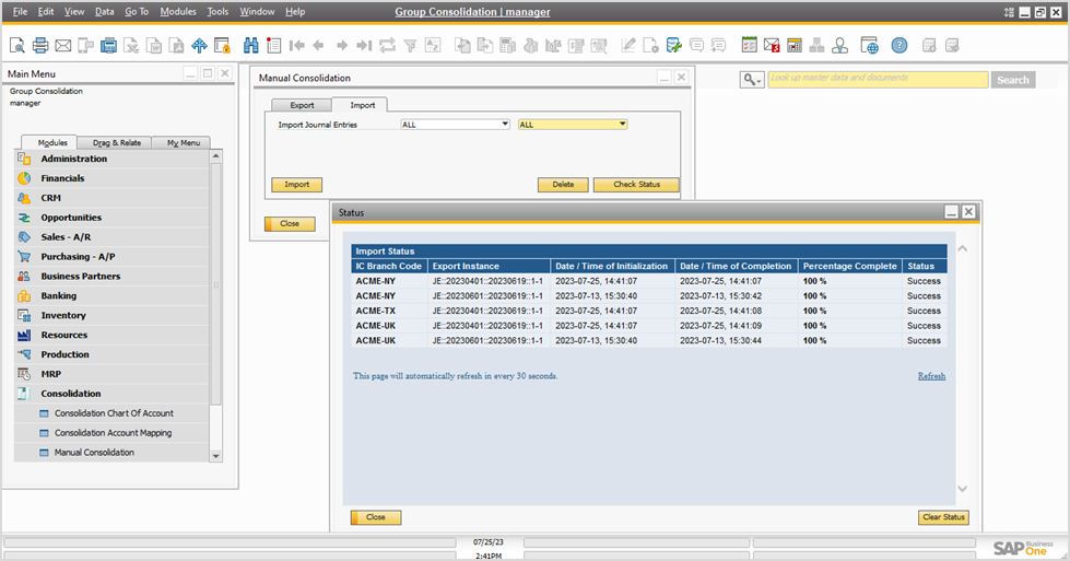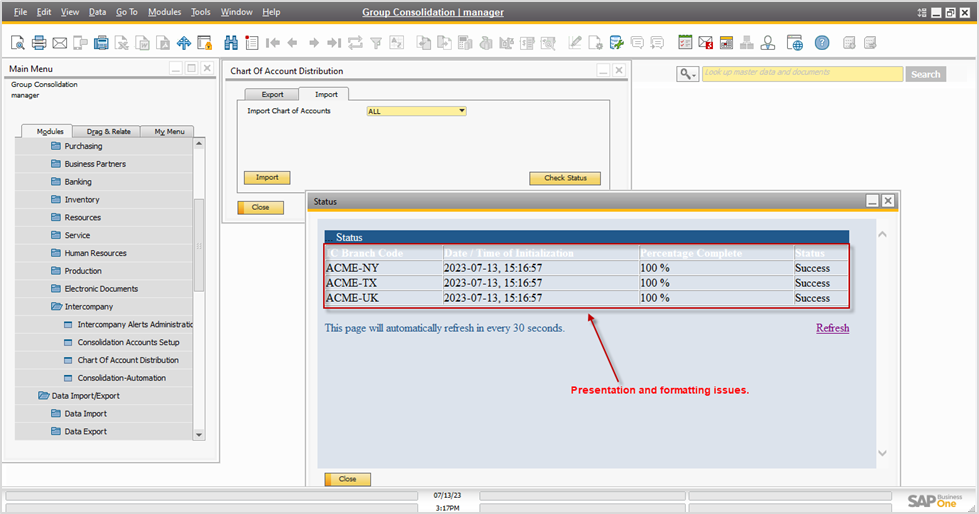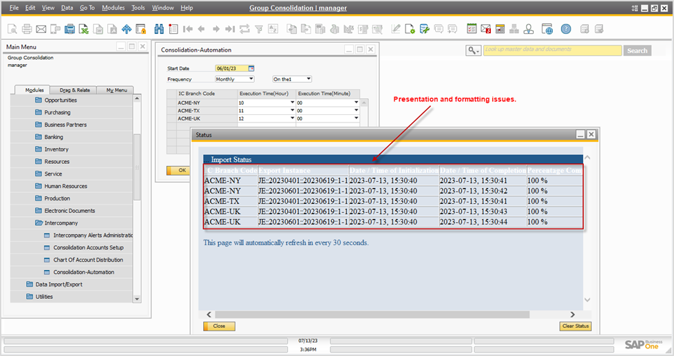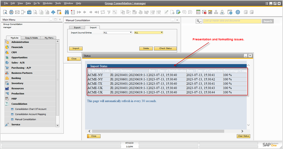 There are presentation and formatting issues in the "Automatic Consolidation – Import Status". Also, the column header names do not appear properly.