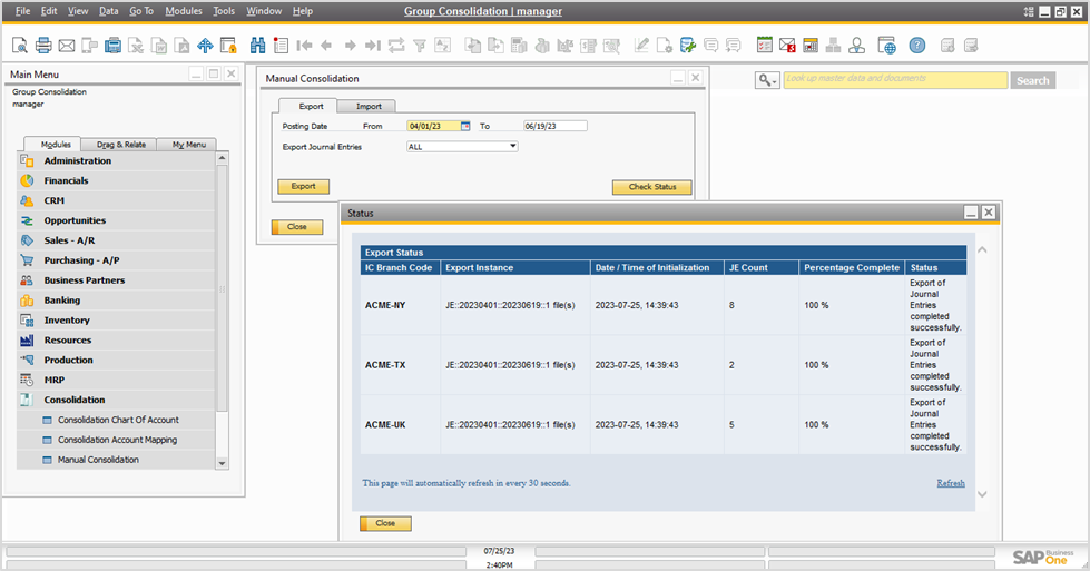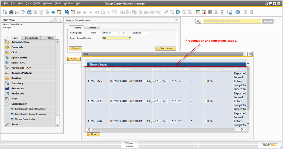 There are presentation and formatting issues in the "Manual Consolidation – Export Status". Also, the column header names do not appear properly.