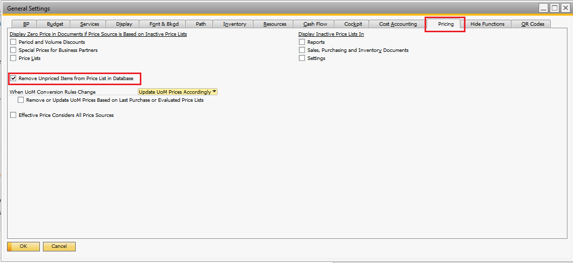 Unable to replicate unit price for a global price list on Item Master Data in participating companies if the checkbox “Remove unpriced items from Price List in Database” in the Pricing tab of General Settings in SAP Business One is selected or you are using the HANA database.