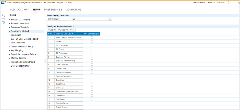 To replicate the data using the Service Layer, Go to Intercompany Administration Console-->Setup -->Replication Method: