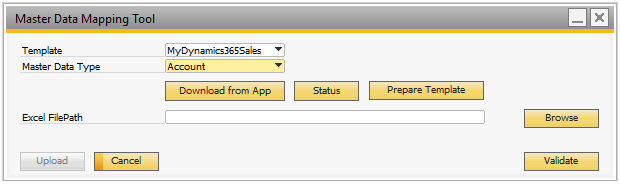 5. Once the data download is complete, choose the Prepare Template button to generate the Microsoft Excel-based template for the selected master i.e. Account or Contact or Lead or product. The application downloads the data from Microsoft Dynamics 365 Sales.