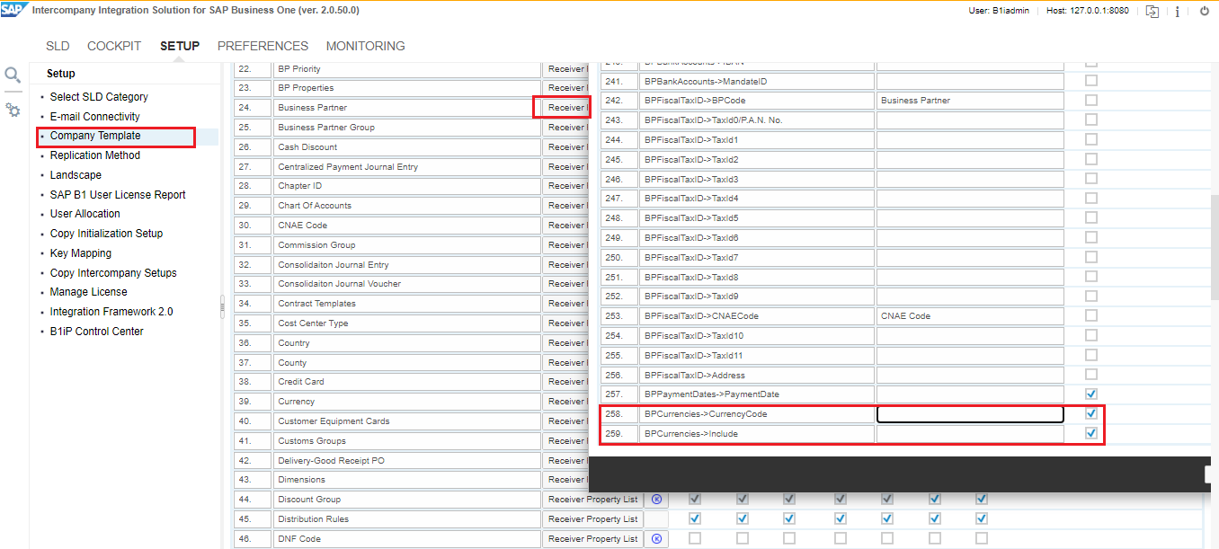 To replicate the currencies in the "All Currencies" list on Business Partner Master Data to participating companies, select the following properties in the Business Partner company template: