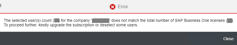 The following error for license mismatch may occur during the User Allocation for all the branch companies together if one of the databases name is contained in the name of another database in the landscape: