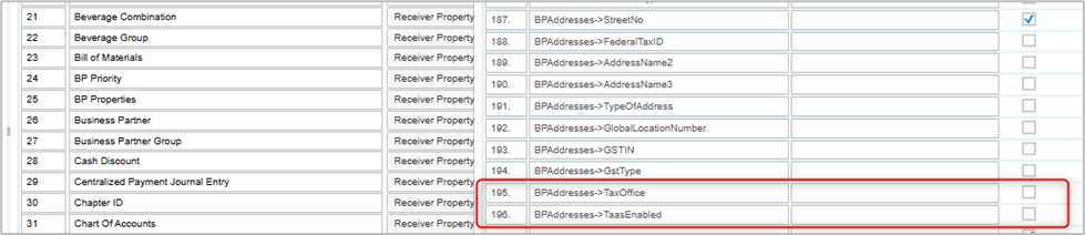 To enable the replication of TaxOffice and TaasEnabled information, these properties must be selected under the Business Partner object in the custom company template.