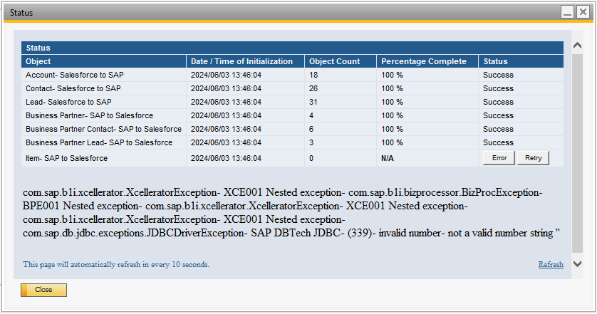 "Not a valid string" error occurs while initializing items from SAP to Salesforce