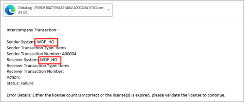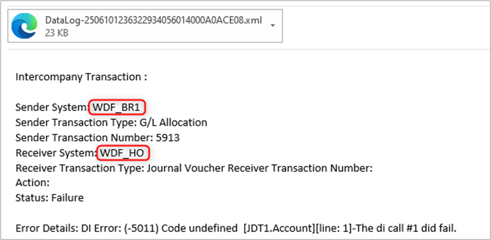 The receiver branch code is displayed in both the sender and receiver systems within system alerts and email alerts for failed intercompany transactions.