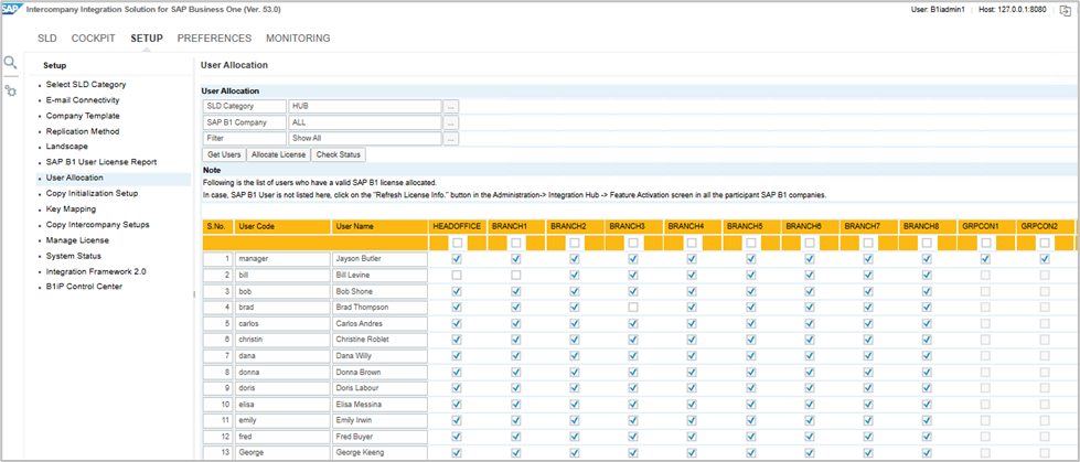 To open the User Allocation screen, go to Intercompany Administration Console and navigate to Setup and choose User Allocation: