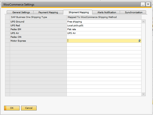 To map the shipping methods in WooCommerce Settings in SAP Business One, Go to Administration-->Integration Hub-->WooCommerce Settings and Navigate to Shipment Mapping tab.