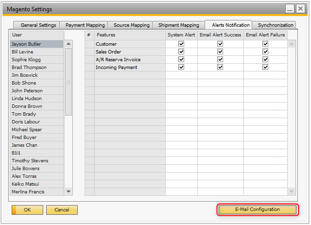 To configure the email alert notification in SAP Business One, Go to Administration --> Integration Hub --> Magento Settings and Navigate to the Alert Notification tab: