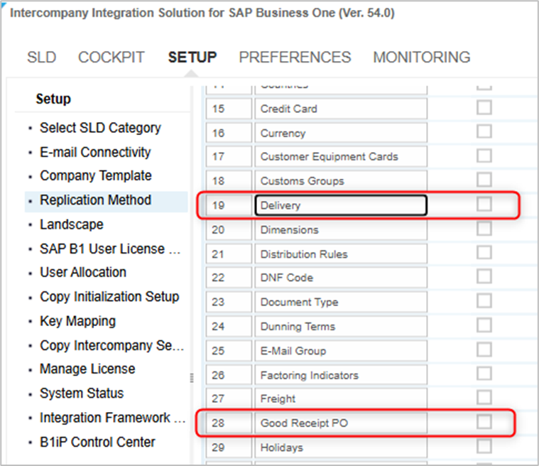 1. To enable the replication of Delivery to Goods Receipt PO document exchange using the Service Layer, Go to Intercompany Administration Console-->Setup -->Replication Method: