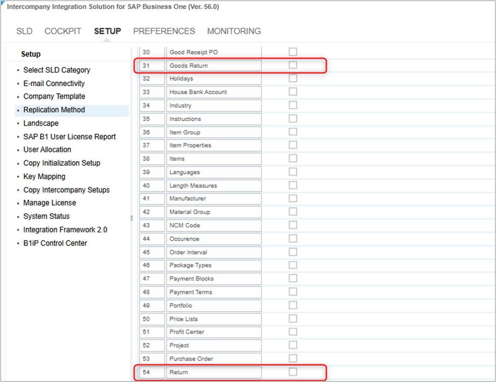 1. To enable the replication of Goods Return to Return document exchange using the Service Layer, go to Intercompany Administration Console-->Setup -->Replication Method: