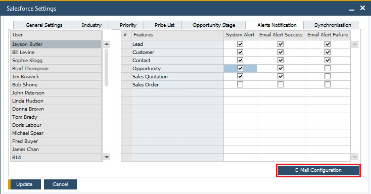 To open the E-mail Configuration setup in SAP Business One, you can click the Email Configuration button on the Alerts Notification tab of Salesforce Settings or go to Administration --> Integration Hub -->E-mail Configuration: