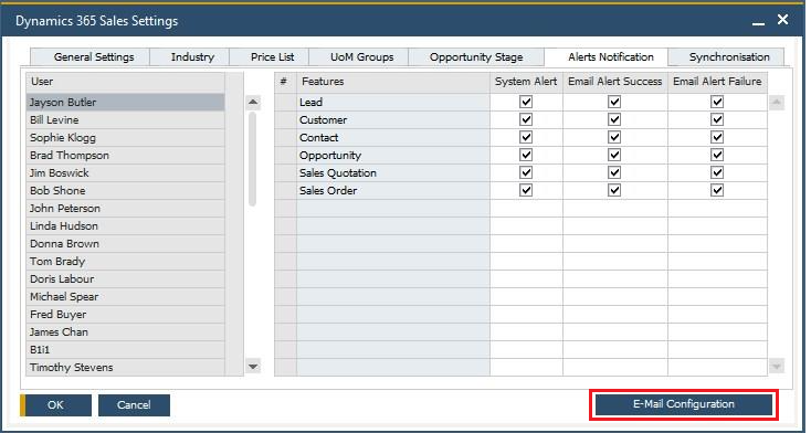 To open the E-mail Configuration setup in SAP Business One, you can click the Email Configuration button on the Alerts Notification tab of Dynamics 365 Sales Settings or go to Administration --> Integration Hub -->E-mail Configuration: