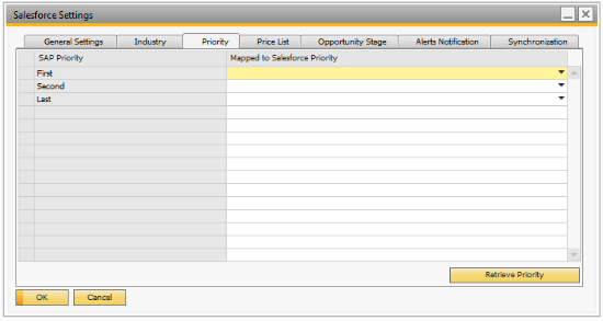 The Priority List is not retrieved or displayed in the Salesforce Settings screen within SAP Business One. The following are the steps to reproduce the issue:
