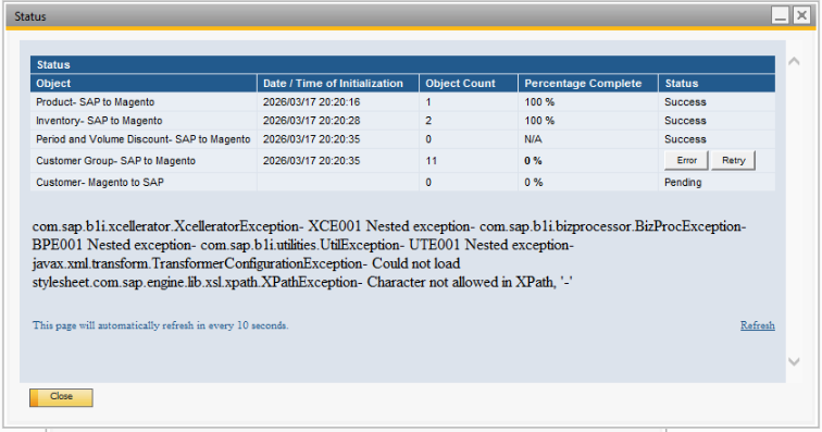 The following error may occur while initializing the Customer Group in the Magento Connector: “Character not allowed in XPath.”